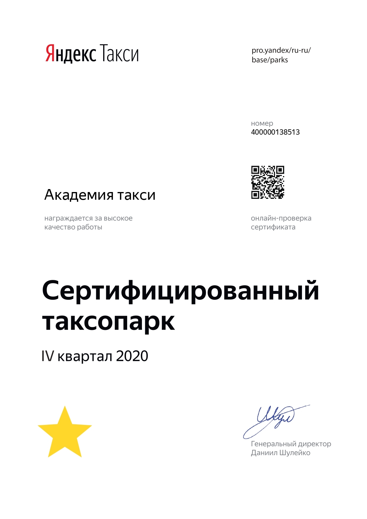 Завершена сертификация партнёров Яндекс.Про за четвертый квартал 2020 года. По её итогам мы получили статус сертифицированного таксопарка.